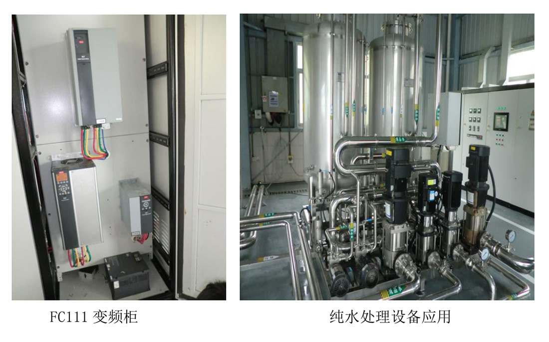 該廠純水處理設備使用的變頻器基本用于控制水泵,使用功率多在55KW以下,控制三相異步電機,主要用于恒壓供水和睡眠,并且要求有較高的節能效果。而FC111系列變頻器剛剛好就是為水處理而生的,FC111功率范圍可以達到90KW,滿足市面上大部分的水泵要求;具有過程閉環控制器(PID 控制器),只要把壓力變送控制器直接接到變頻器上,然后簡單設置PI值,就能輕松滿足客戶恒壓供水的要求;具有睡眠功能,只要激活睡眠功能,設置睡眠速度、喚醒速度和睡眠時間等幾個參數就能實現睡眠功能。睡眠功能的邏輯是變頻器速度達到睡眠速度以下數秒則進入睡眠狀態,睡眠狀態變頻器速度為 0,而當水管系統壓力低于給定壓力數秒則進入喚醒狀態,變頻器繼續閉環運行。