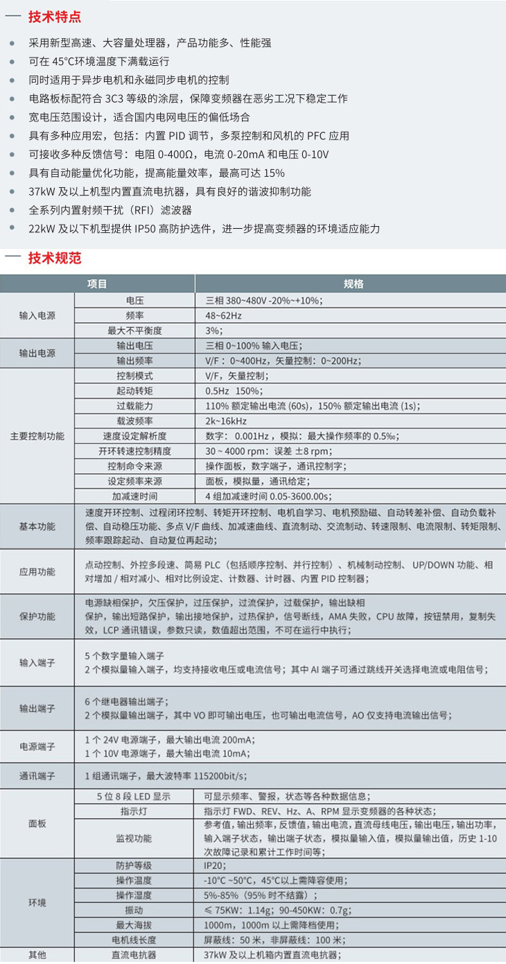 22kW及以下機型提供IP50高防護選件,進一步提高變頻器的環境適應能力