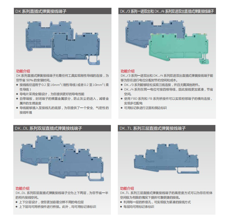 DK系列直插式彈簧接線端子無需任何工具實現剛性導線的連接,為您節省50%的安裝時間。