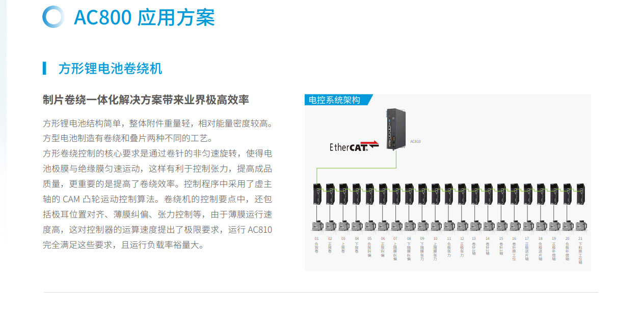 AC800 高性能智能機(jī)械控制器,是基于Intel X86 處理器硬件平臺(tái),符合PLCopen 規(guī)范的高性能多軸運(yùn)動(dòng)控制器,以EtherCAT 為總線,可以實(shí)現(xiàn)多軸伺服控制,尤其適用于先進(jìn)制造業(yè)的高速生產(chǎn)裝備和大型設(shè)備的控制。